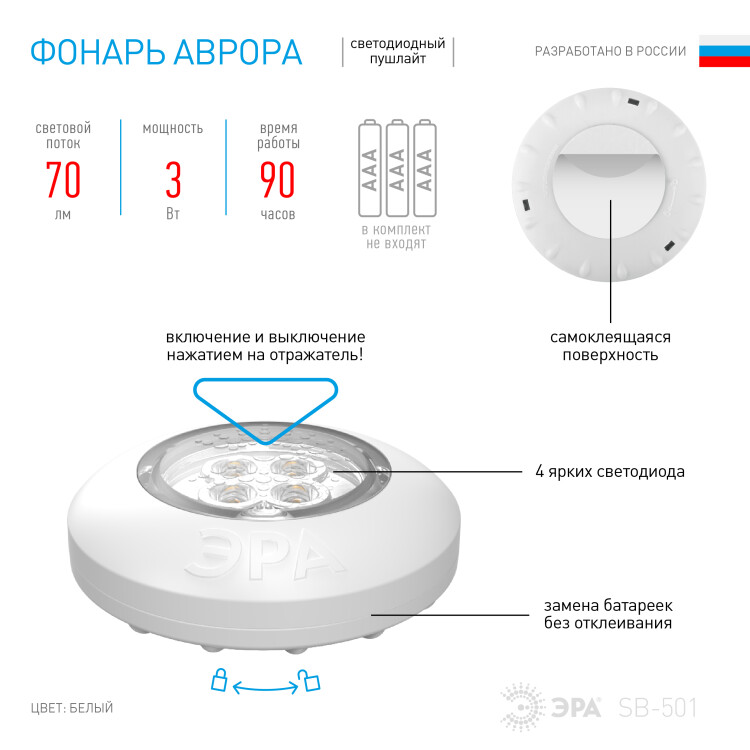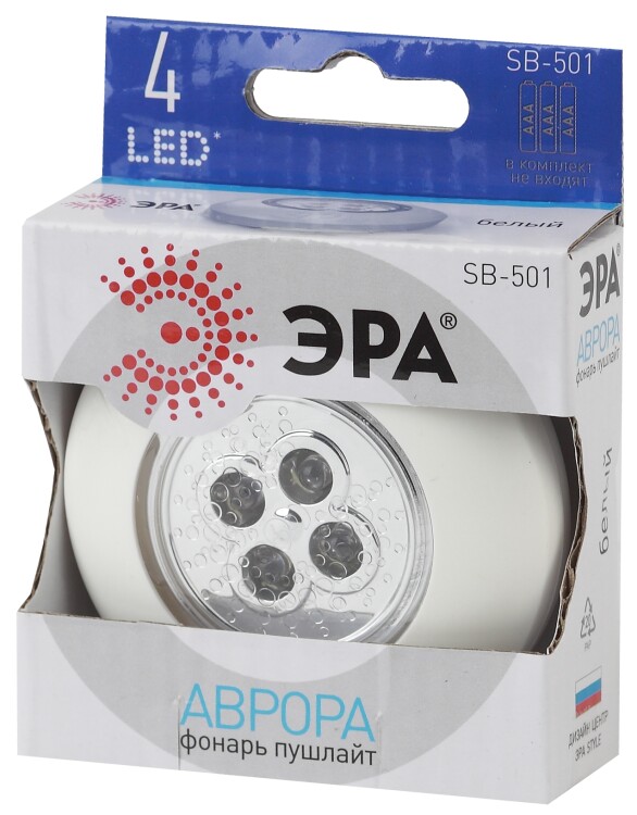 Фонарь SB-501 Аврора - компактный самоклеящийся фонарь-подсветка, который включается простым нажатием на корпус. Устанавливается очень просто - достаточно отклеить стикер от самоклеящейся поверхности и приклеить прибор туда, где требуется дополнительное освещение. 4 белых светодиода нового поколения светят мягким ровным светом, не мерцают, не нагреваются и имеют длительный срок службы. Дальность луча - 5 метров. Этот удобный и практичный фонарь можно с успехом использовать для декоративного освещения, в качестве подсветки или как аварийный свет. Благодаря лаконичному универсальному дизайну и базовому цвету корпуса фонарь подойдет к любому интерьеру. ЭРА SB-501 используется на лестницах, в коридорах, прихожих, кладовках, в шкафах и тумбочках. Подходит для машин, лодок и кемпинга. Работает от 3 мизинчиковых батареек, которые легко сменить, не отклеивая фонарь, а просто открутив верхнюю часть корпуса.