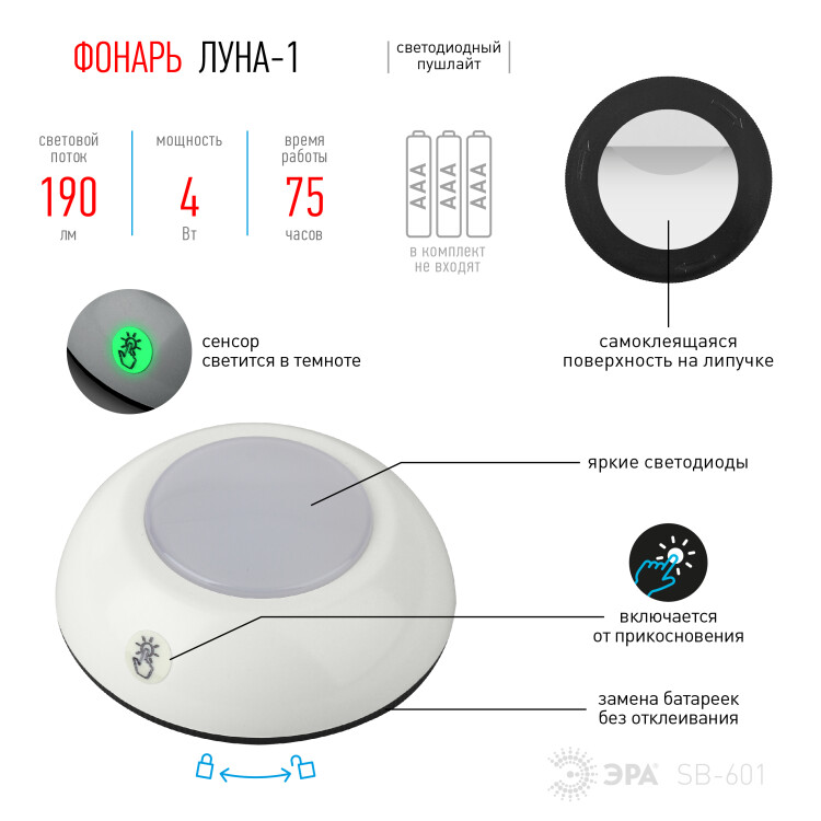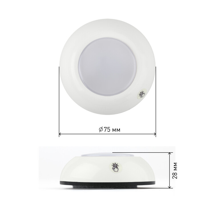 Фонарь-пушлайт "Луна-1" практичный и в тоже время простой фонарь для повседневного использования. Преимущество такого фонаря - долгий срок службы, яркие светодиоды и портативность. Этот компактный фонарь отлично подойдёт для освещения тёмных полок, лестниц, отдалённых плохо освещаемых углов гаража или подсобки. При этом лаконичный дизайн пушлайта позволяет его использовать не только как аварийное освещение, но и как декоративное дополнение. Фонарь Луна-1 выполнен в классическом дизайне, нейтральный белый ободок и центральная светящаяся часть. Фонарь быстро и надёжно крепится к любой поверхности с помощью самоклеящегося элемента. При этом пушлайт не нужно отклеивать, чтобы заменить батарейки. Функциональный бытовой фонарь работает 75 часов без перерыва.Фонарь оснащён специальным маяком - стикером, который светится постоянно и является светонакопителем. Светит мягким зелёным светом, что позвонит найти фонарь без проблем в тёмном помещении. Фонарь-пушлайт оснащён светодиодами нового поколения, которые светят более качественным и ярким светом. Диоды СОВ (chip on board - мультикристалл на плате) представляют собой множество LED элементов, размещённых на небольшой пластине. Фонарь обладает широким углом освещения, а дальность луча составляет 5 метров.