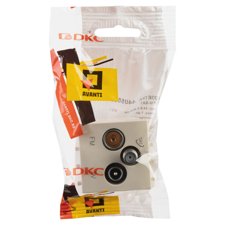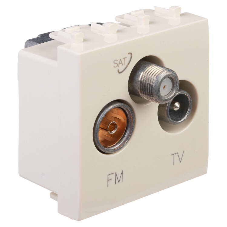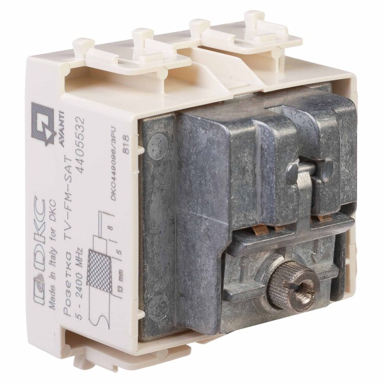 Розетк а TV-FM-SAT модульная. Назначение: для монтажа в систему кабельных коробов «In-liner Front» и систему организации рабочих мест «Сотто» (Sotto) при помощи рамок-суппортов и каркасов «Avanti» (код 4400912 и т. д.), подключение теле- и радиокабеля. Характеристики: винтовые зажимы; диапазон рабочих частот 4–2400 МГц; затухание.