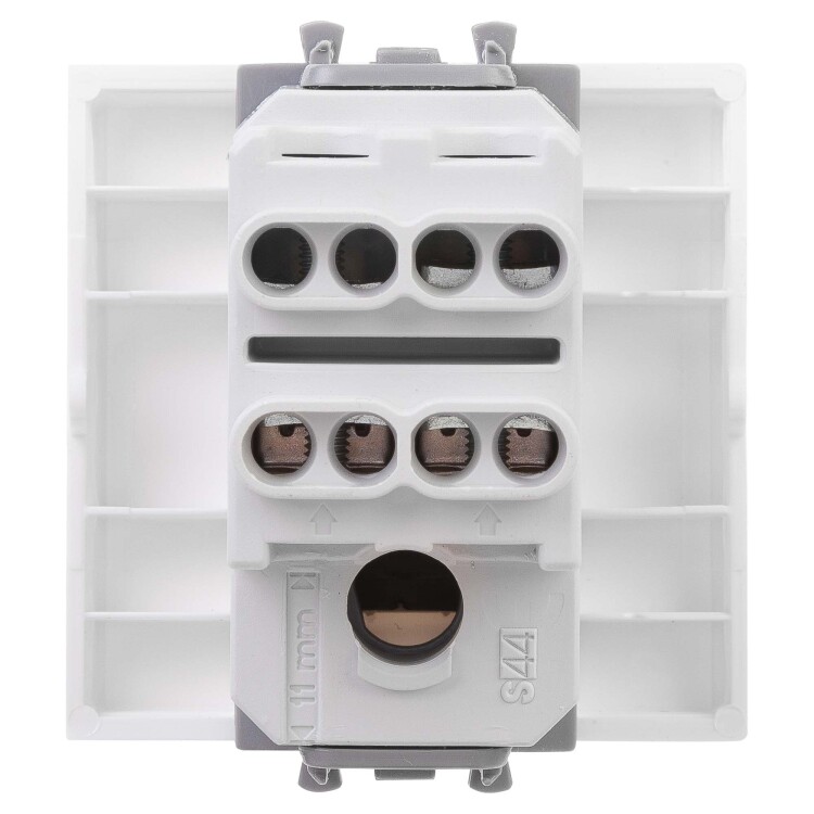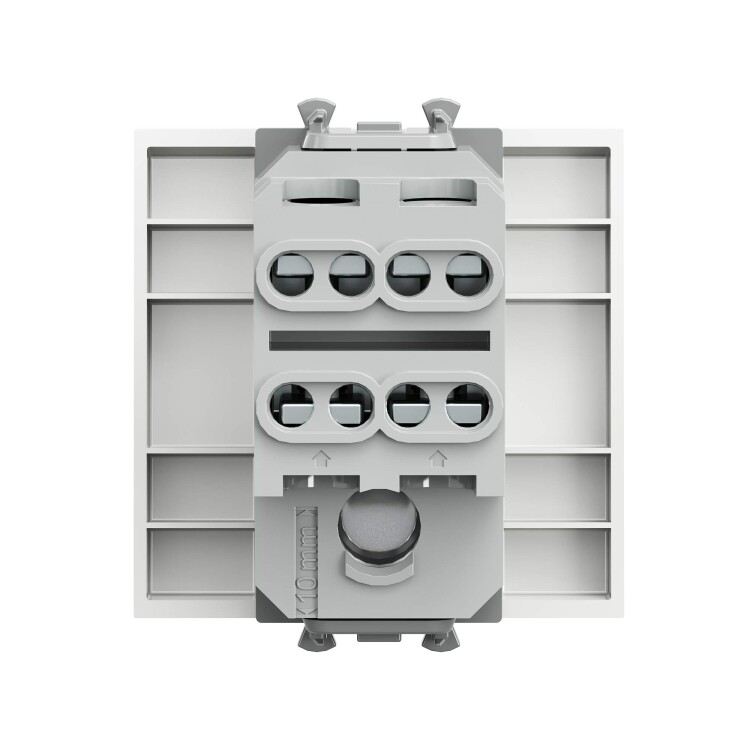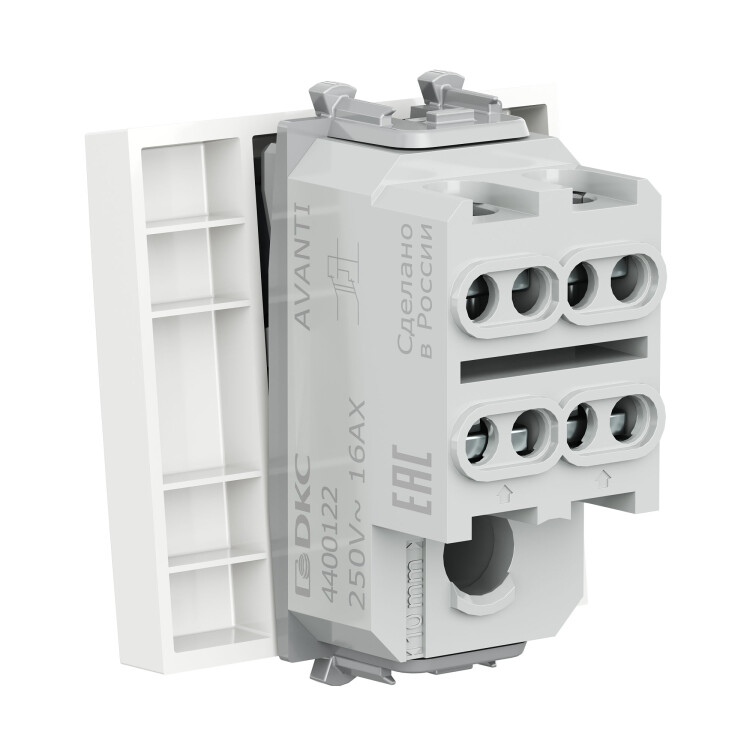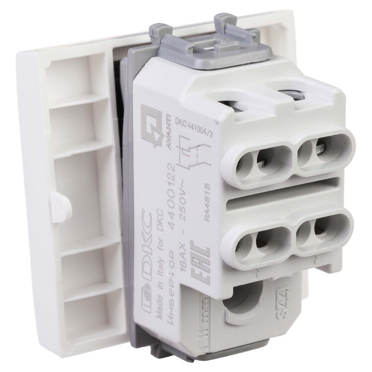 Инвертор одноклавишный модульный. Назначение: для монтажа в систему пластиковых коробов «In-liner Front» и систему организации рабочих мест «Сотто» (Sotto) при помощи рамок-суппортов и каркасов «Avanti» (код 4400912 и т. д.). Используется для включения/выключения освещения с трёх и более точек. Характеристики: диаметр отверстий для ввода кабелей — 3 мм (по 2 отверстия на одну клемму); винтовые зажимы; шаблон для зачистки кабеля — 11 мм; номинальный ток — 16 A; номинальное напряжение — 230 В; фиксация в подрозеточные коробки при помощи каркаса с лапками (код 4400802) и саморезов. Количество модулей: 2. Цвет: «Белое облако». Производитель оставляет за собой право вносить во внешний вид изделия изменения, которые не влияют на его функционал, безопасность и надёжность.
