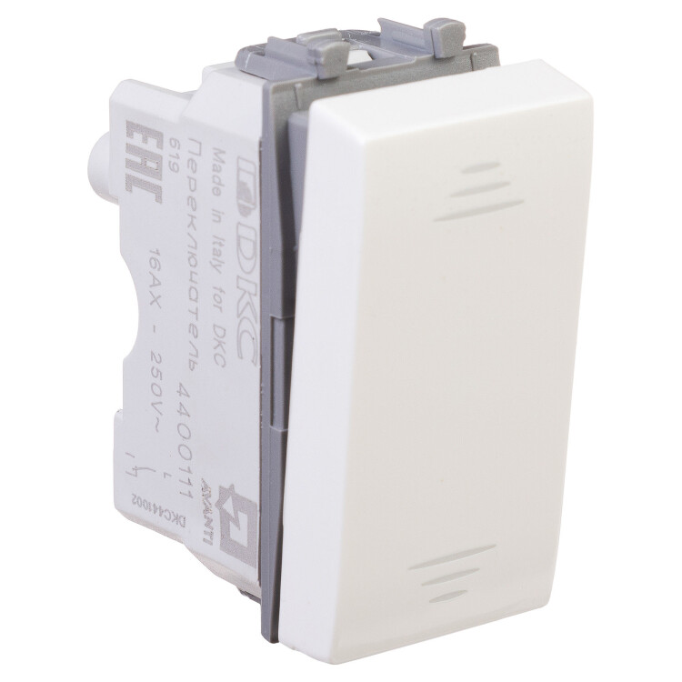 Переключатель модульный серии «Avanti». Предназначен для монтажа в систему пластиковых коробов «In-liner Front» и систему организации рабочих мест «Сотто» (Sotto) при помощи рамок-суппортов и каркасов «Avanti» (код 4400912 и т. д.); используется для включения/выключения освещения из двух мест. Диаметр отверстий для ввода кабелей — 3 мм (по 2 отверстия на одну клемму); винтовые зажимы; шаблон для зачистки кабеля — 11 мм; номинальное напряжение — 230 В. Фиксация в подрозеточные коробки при помощи каркаса с лапками (код 4400802) и саморезов. 1 модуль. Цвет: «Белое облако». Производитель оставляет за собой право вносить во внешний вид изделия изменения, которые не влияют на его функционал, безопасность и надёжность.