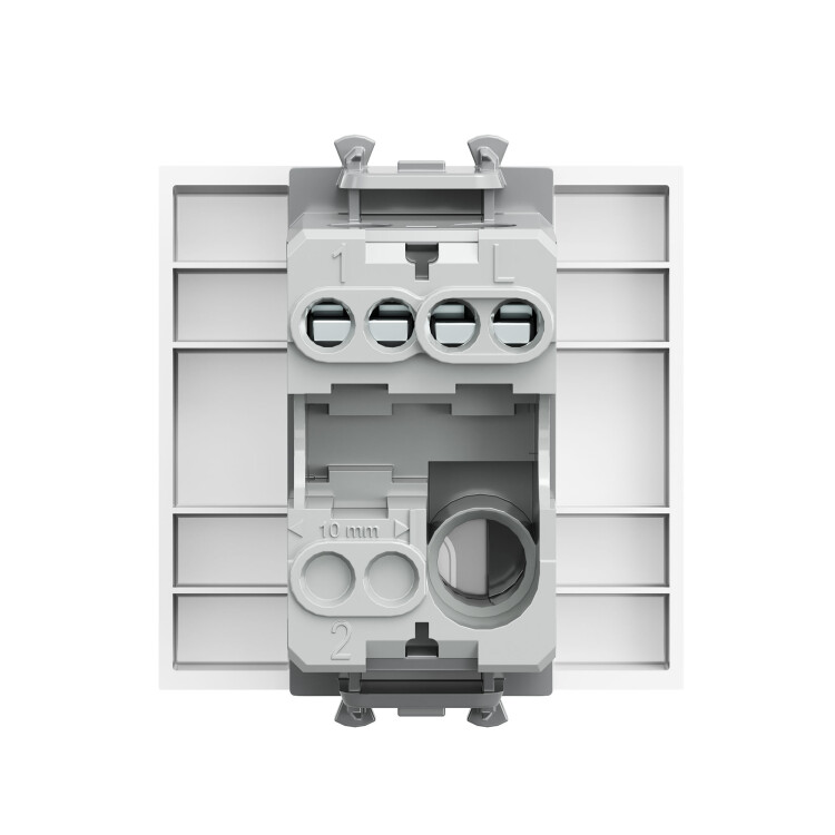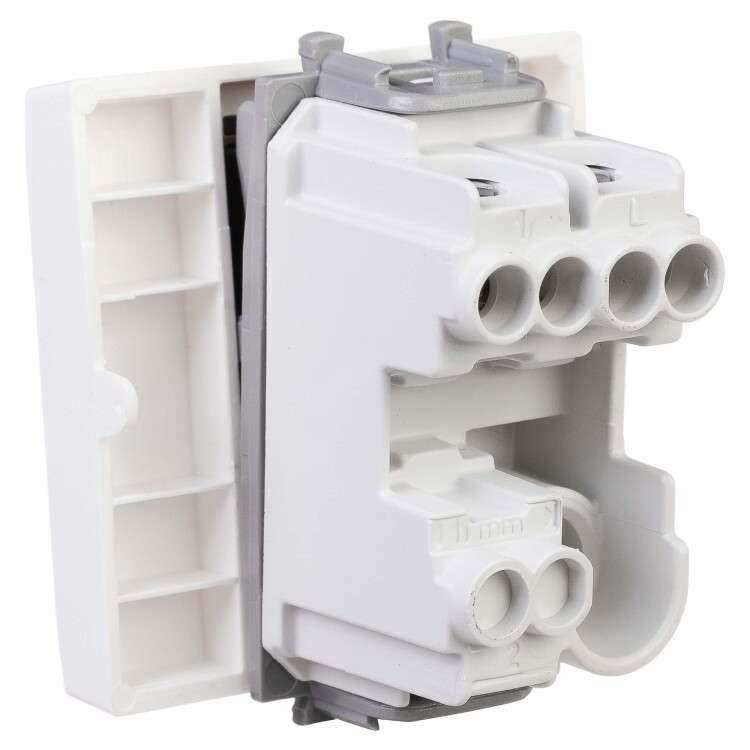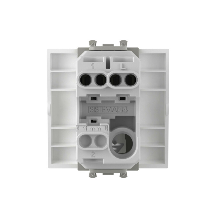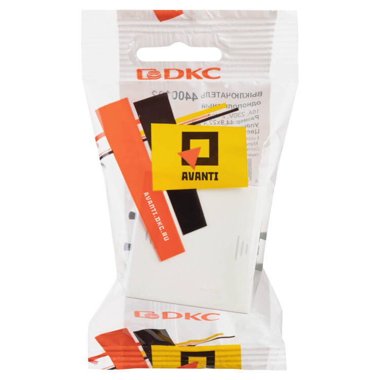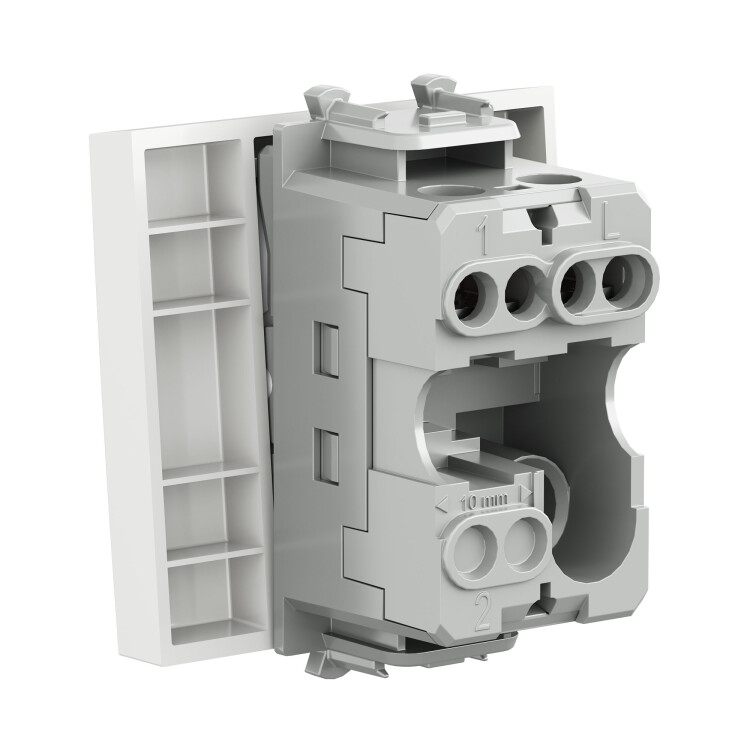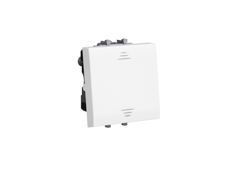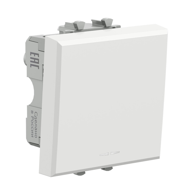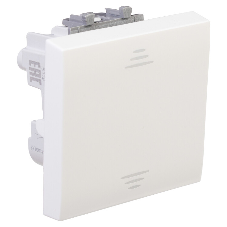 Выключатель одноклавишный однополюсный, модульный. Предназначен для монтажа в систему пластиковых коробов «In-liner Front» и систему организации рабочих мест «Сотто» (Sotto) при помощи рамок-суппортов и каркасов «Avanti» (код 4400912 и т. д.); используется для включения/выключения освещения. Характеристики: диаметр отверстий для ввода кабелей — 3 мм (по 2 отверстия на одну клемму); винтовые зажимы; шаблон для зачистки кабеля — 11 мм; номинальный ток — 16 A; номинальное напряжение — 230 В; возможна фиксация в подрозеточные коробки при помощи каркаса с лапками (код 4400802) и саморезов. 2 модуля. Цвет: «Белое облако». Производитель оставляет за собой право вносить во внешний вид изделия изменения, которые не влияют на его функционал, безопасность и надёжность.
