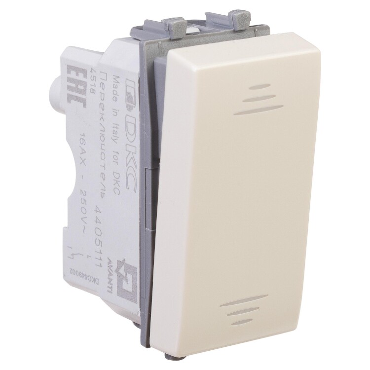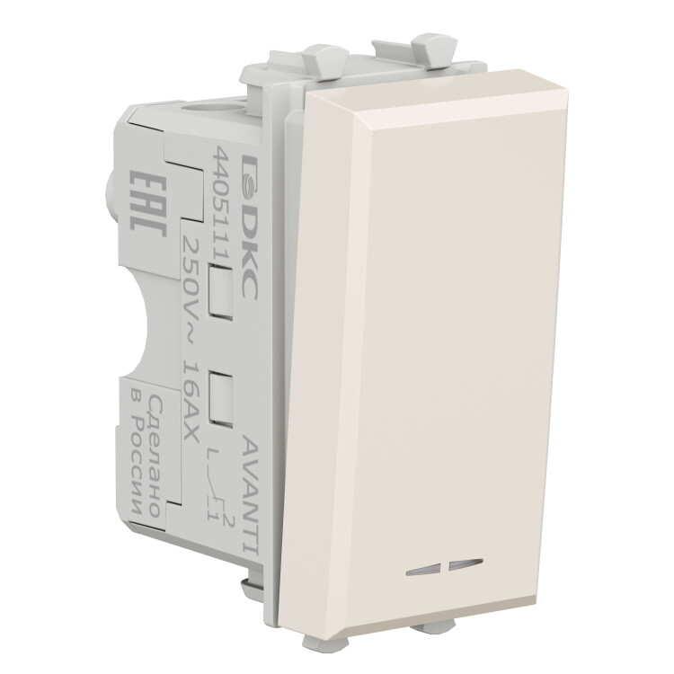 Переключатель модульный серии «Avanti». Предназначен для монтажа в систему кабельных коробов «In-liner Front» и систему организации рабочих мест «Сотто» (Sotto) (алюминиевые кабель-каналы, колонны, башенки и лючки) при помощи рамок-суппортов и каркасов «Avanti» (код 4400912 и т. д.). Используется для включения/выключения освещения с двух мест. Диаметр отверстий для ввода кабелей — 3 мм (по 2 отверстия на одну клемму); винтовые зажимы; шаблон для зачистки кабеля — 11 мм; номинальное напряжение — 230 В. Фиксация в подрозеточные коробки при помощи каркаса с лапками (код 4400802) и саморезов. 1 модуль. Цвет: «Ванильная дымка». Производитель оставляет за собой право вносить во внешний вид изделия изменения, которые не влияют на его функционал, безопасность и надёжность.