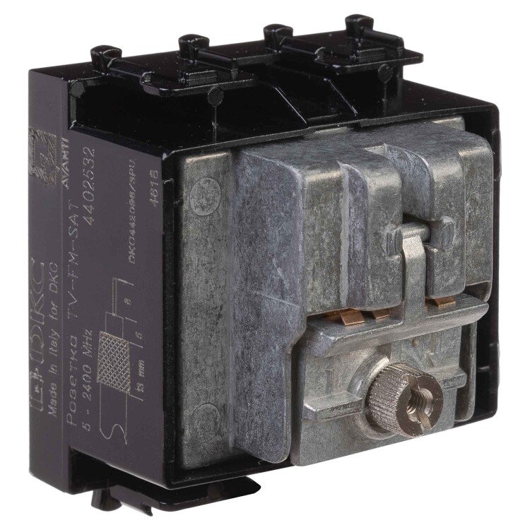 Розетк а TV-FM-SAT модульная. Назначение: для монтажа в систему кабельных коробов "In-liner Front" и систему алюминиевых кабельных коробов и колонн "Aero", лючки и башенки BUS, при помощи рамок-суппортов и каркасов "Avanti" (код 4400912 и т.д.); подключение теле- и радиокабеля. Характеристики: винтовые зажимы; диапазон рабочих частот 4–2400 МГц; затухание