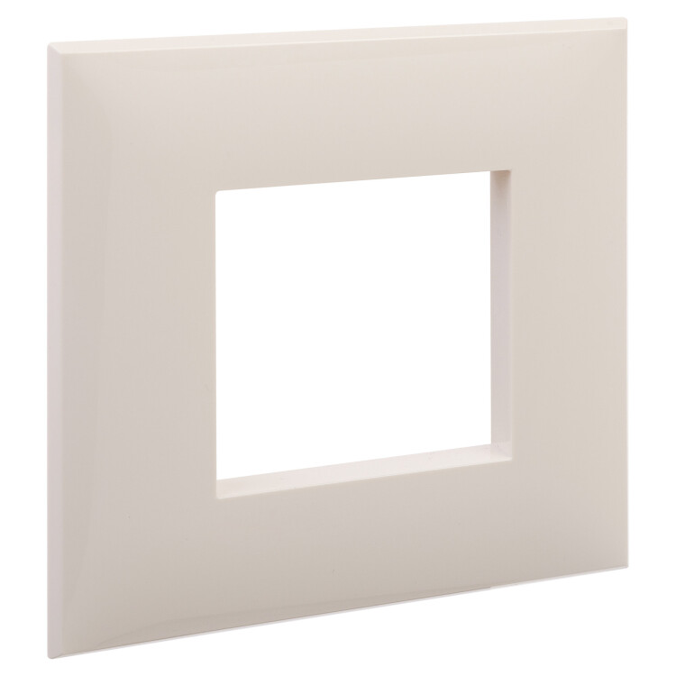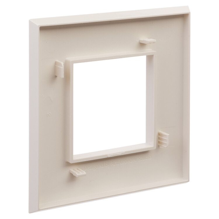 Рамка рассчитана на установку одного изделия (максимум 2 модуля). Допустимо размещать рамку как горизонтально, так и вертикально. Габаритные размеры: 90х90 мм. Материал – термопласт.