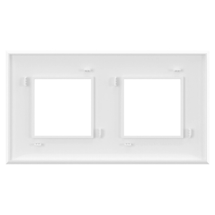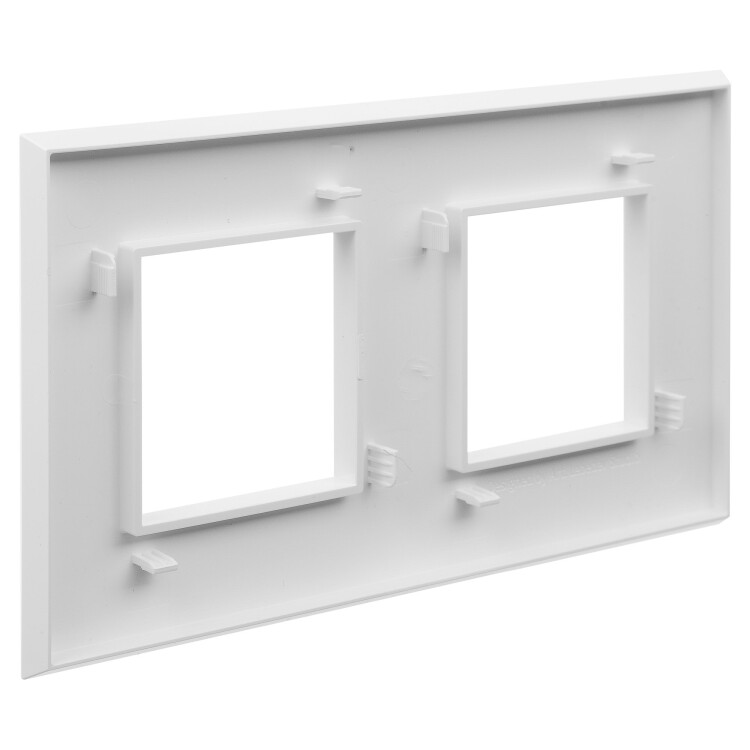 Рамка имеет 2 места под электроустановочные изделия (максимальная вместимость – 4 модуля), может размещаться как горизонтально, так и вертикально. Габаритные размеры: 160х90 мм. Материал – термопласт.