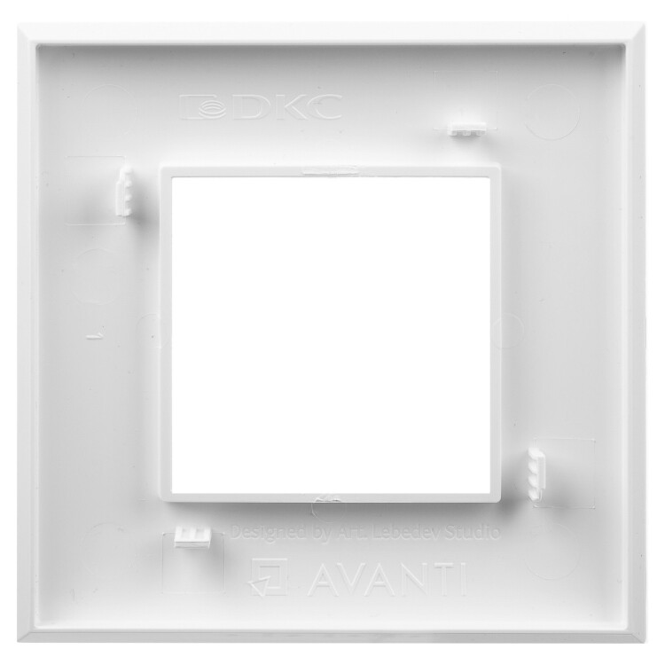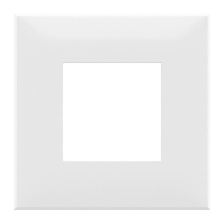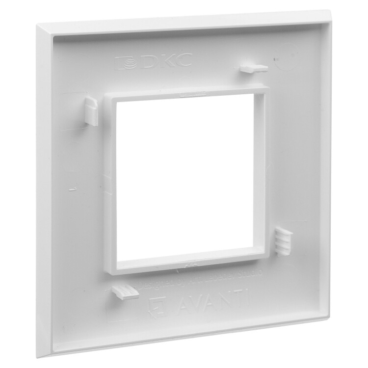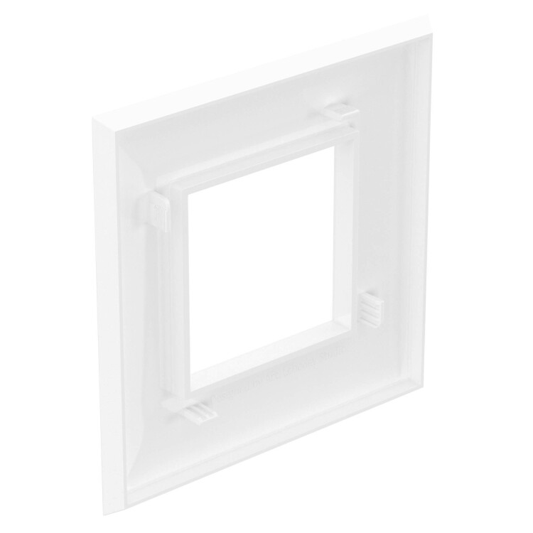 Рамка имеет 1 место под электроустановочное изделие (максимальная вместимость – 2 модуля), может размещаться как горизонтально, так и вертикально. Габаритные размеры: 90х90 мм. Материал – термопласт.