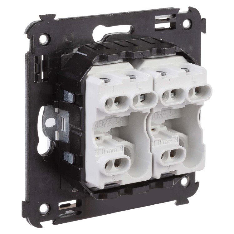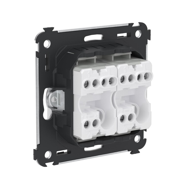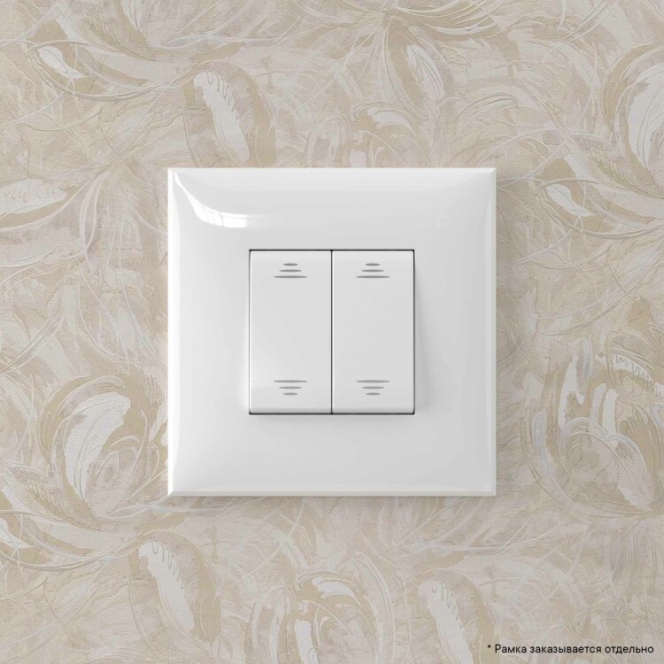 Задача двухклавишного переключателя – управление двумя контурами освещения из двух точек. Он позволяет включить/выключить освещение двумя светильниками из удобной точки – например, в спальне переключатель может размещаться возле кровати. Переключатель предназначен для скрытого монтажа в стену. Номинальное напряжение – 230 В, номинальный ток – 16 А.