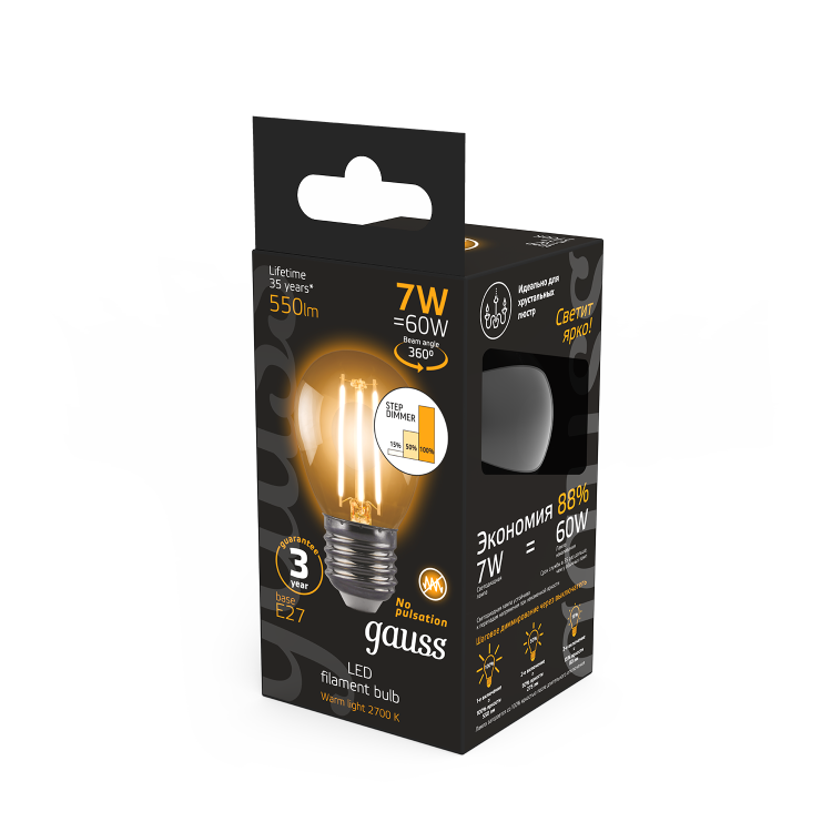 Возможность регулировки яркости ламп пользуется большим спросом в различных сферах применения. В первую очередь в сегменте HoReCa, а также в бытовом и коммерческих сегментах. В ассортименте филаментных ламп Gauss в том числе присутствуют и такие модели. Регулировка яркости ламп позволяет не только создать нужную атмосферу в помещении, но и экономить на расходе электроэнергии.