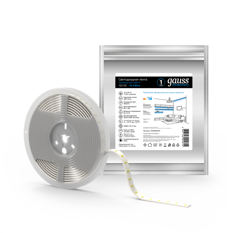 Лента Gauss LED Elementary 5050/60-SMD 14.4W 12V DC холодный белый IP20 (ZIP Bag 5м)