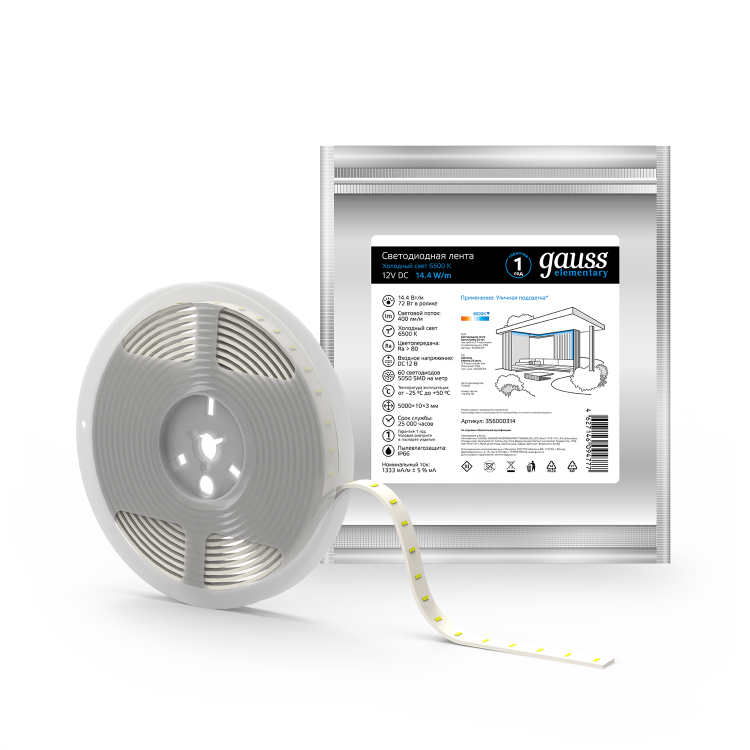 Лента Gauss LED Elementary 5050/60-SMD 14.4W 12V DC холодный белый IP66 (ZIP Bag 5м)