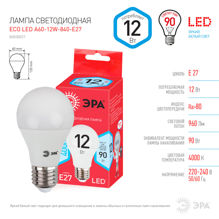 Лампочка светодиодная ЭРА RED LINE ECO LED A60-12W-840-E27 Е27 / E27 12Вт груша нейтральный белый свет (кр. 1шт)