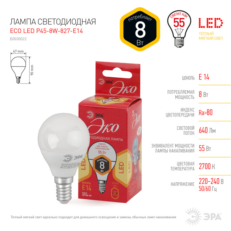 Бытовая светодиодная лампа ЭРА Серии Бюджет, создаёт яркое ровное освещение и экономит до 90% электроэнергии по сравнению с лампой накаливания с аналогичным световым потоком. Светит теплым светом с жёлтым оттенком - такая цветовая температура эффективна для отдыха и уютной атмосферы в доме. Используется в потолочных, настенных, настольных светильниках, в люстрах и бра. Мгновенно включается и не нагревается.