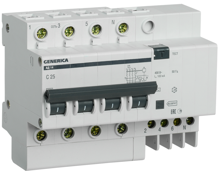 Диф. автомат АД14 4Р 25А 100мА GENERICA (кр.24шт)