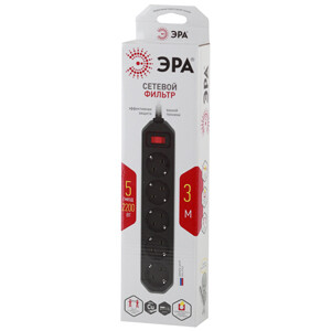 USF-5es-3m-B-BOX Сет.фильтр ЭРА (черный) с заземл, 3x0,75мм2, с выкл, 5гн, 3м (20/480) | Б0020356
