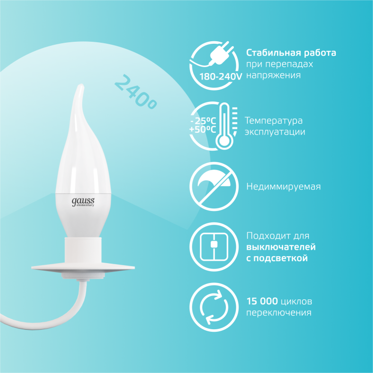 Светодиодные лампы Gauss Elementary Candle созданы в форме свечи. Лампы подойдут как для домашнего, так и для коммерческого использования. Такой тип освещения прекрасно смотрится в светильниках без плафонов или устанавливается в люстры и бра. Модель обладает широким диапазоном цветовых температур и мощностей, что поможет создать атмосферу тепла и уюта или концентрации. Равномерный спектр света создает зрительный комфорт в любом помещении. Данный тип освещения от Gauss обеспечивают стабильную работу в течение всего срока службы.