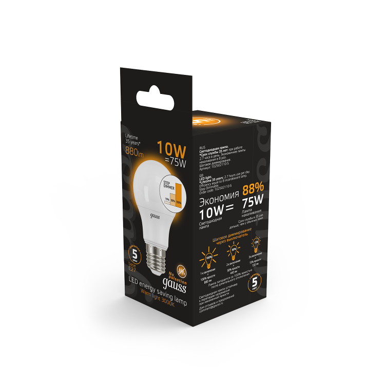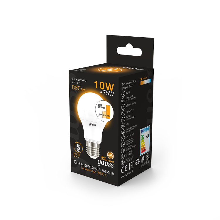 Лампа Gauss A60 с поддержкой шагового диммирования излучает приятный теплый свет 3000K, способствуя созданию уютной домашней или офисной атмосферы. Благодаря технологии LED, эта лампа обеспечивает высокую энергоэффективность, экономя ваше время и деньги. Подходит для использования с устроиствами регулировки яркости света, помогая добиться нужного освещения для любого занятия или настроения. Переключайте лампу на полный режим во время чтения или другой требовательной к освещению деятельности, и на более теплую и приглушенную яркость для расслабления.