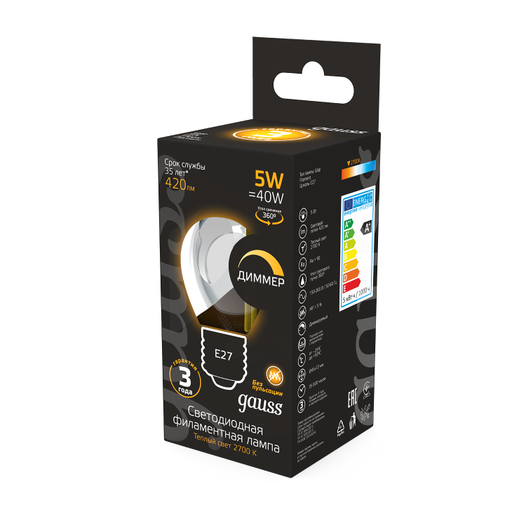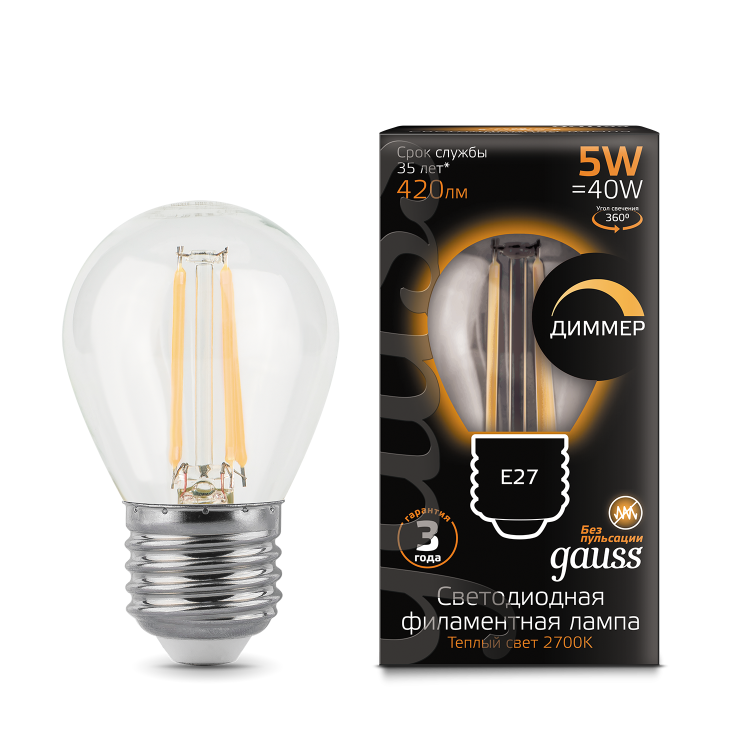 Лампа Gauss LED Filament Globe dimmable E27 5W 2700K 1/10/50 (кр.10шт)