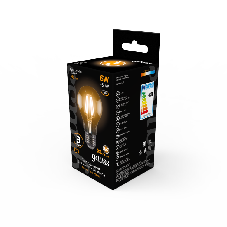 Лампа Gauss LED Filament A60 E27 6W 2700К 1/10/40 (кр.10шт)