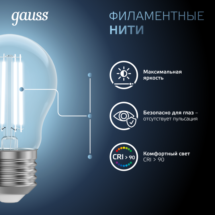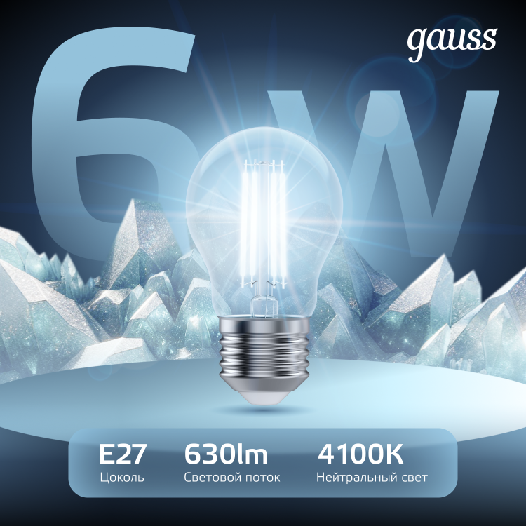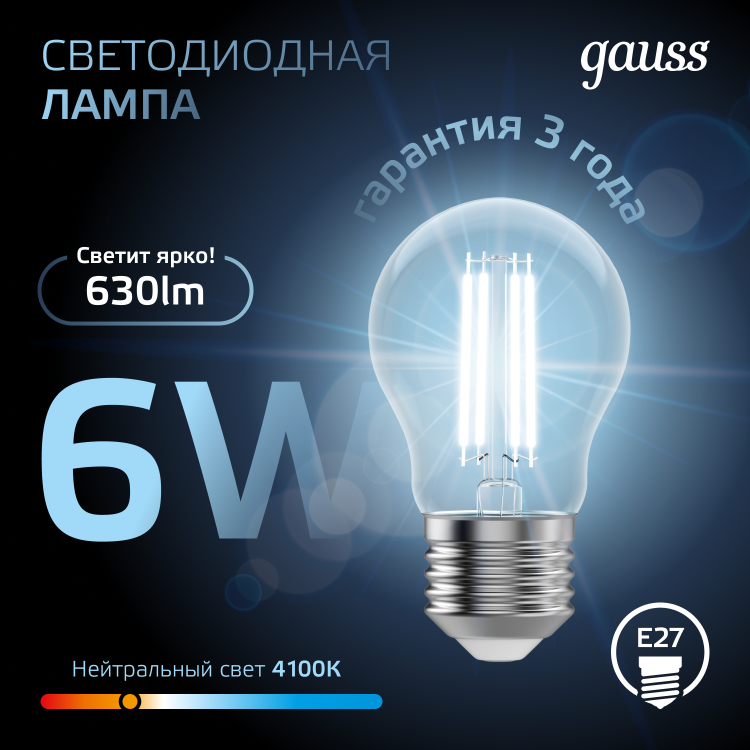 Светодиодные филаментные лампы GAUSS - это новейшие технологии в светотехнике. Лампы имеют привычный вид классических ламп накаливания, освещают пространство на 360о и дают больше света по сравнению с обычными светодиодными лампами за счет прозрачной колбы. Идеально подходят для хрустальных люстр и открытых светильников, а также для реализации дизайнерских решений, где важен вид классических ламп накаливания.