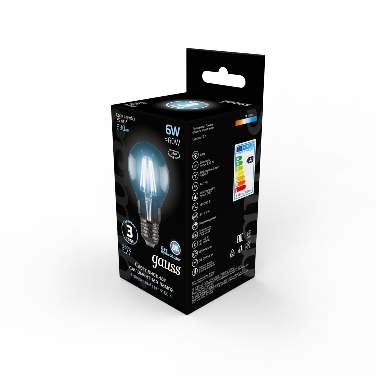 Лампа Gauss LED Filament A60 E27 6W 4100К 1/10/40 (кр.10шт)
