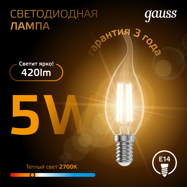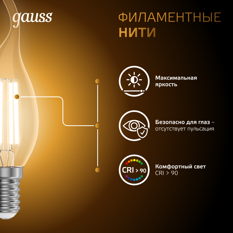 Светодиодные филаментные лампы GAUSS - это новейшие технологии в светотехнике. Лампы имеют привычный вид классических ламп накаливания, освещают пространство на 360о и дают больше света по сравнению с обычными светодиодными лампами за счет прозрачной колбы. Идеально подходят для хрустальных люстр и открытых светильников, а также для реализации дизайнерских решений, где важен вид классических ламп накаливания.
