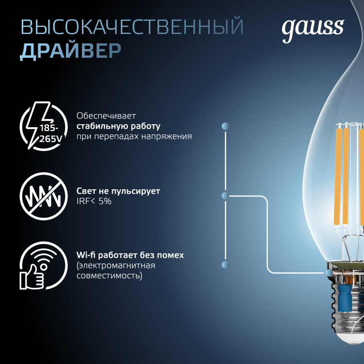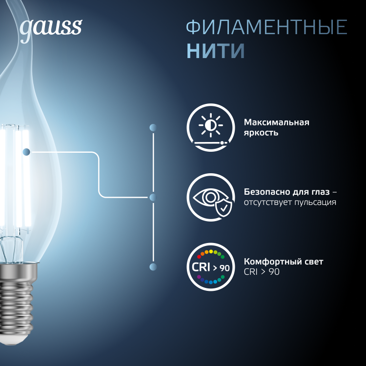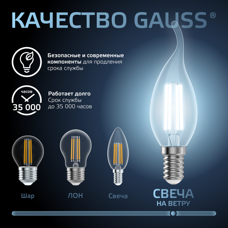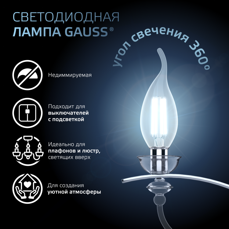 Светодиодные филаментные лампы GAUSS - это новейшие технологии в светотехнике. Лампы имеют привычный вид классических ламп накаливания, освещают пространство на 360о и дают больше света по сравнению с обычными светодиодными лампами за счет прозрачной колбы. Идеально подходят для хрустальных люстр и открытых светильников, а также для реализации дизайнерских решений, где важен вид классических ламп накаливания.