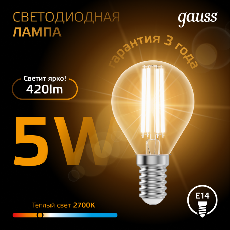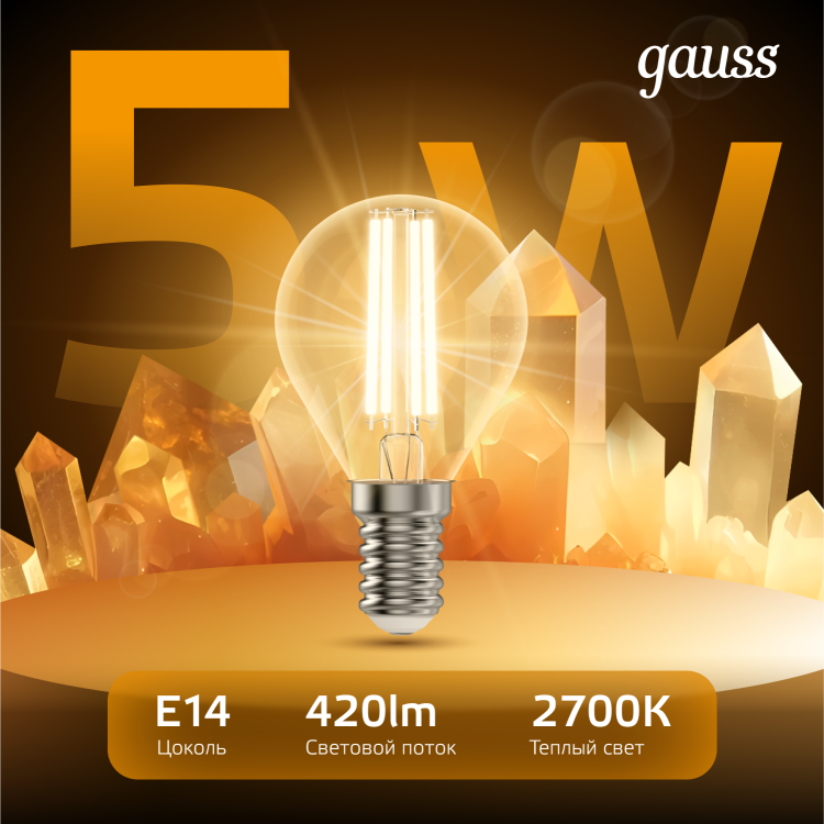 Светодиодные филаментные лампы GAUSS - это новейшие технологии в светотехнике. Лампы имеют привычный вид классических ламп накаливания, освещают пространство на 360о и дают больше света по сравнению с обычными светодиодными лампами за счет прозрачной колбы. Идеально подходят для хрустальных люстр и открытых светильников, а также для реализации дизайнерских решений, где важен вид классических ламп накаливания.