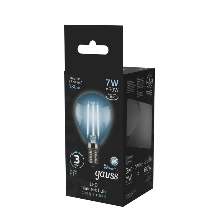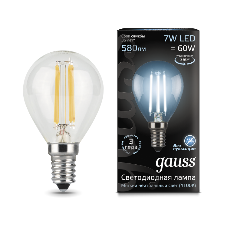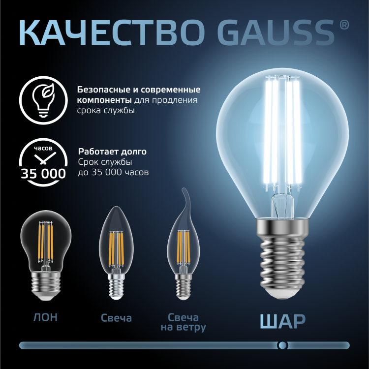 Светодиодные филаментные лампы GAUSS - это новейшие технологии в светотехнике. Лампы имеют привычный вид классических ламп накаливания, освещают пространство на 360о и дают больше света по сравнению с обычными светодиодными лампами за счет прозрачной колбы. Идеально подходят для хрустальных люстр и открытых светильников, а также для реализации дизайнерских решений, где важен вид классических ламп накаливания.