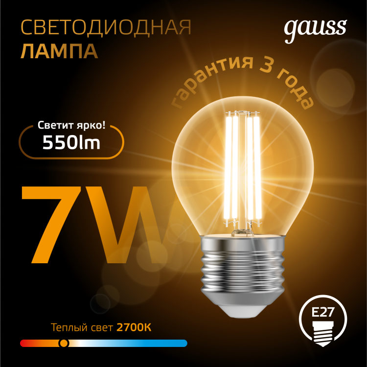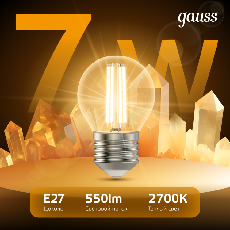 Светодиодные филаментные лампы GAUSS - это новейшие технологии в светотехнике. Лампы имеют привычный вид классических ламп накаливания, освещают пространство на 360о и дают больше света по сравнению с обычными светодиодными лампами за счет прозрачной колбы. Идеально подходят для хрустальных люстр и открытых светильников, а также для реализации дизайнерских решений, где важен вид классических ламп накаливания.
