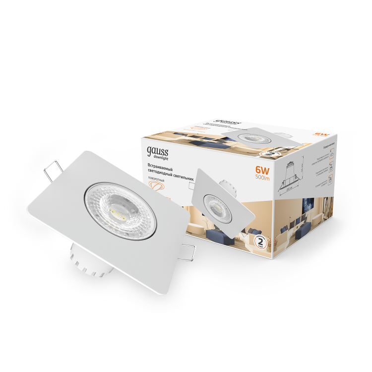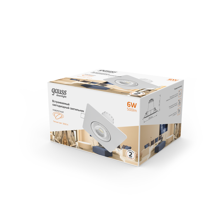 Светильник встраиваемый Gauss Downlight с поворотным спотом, благодаря которому можно более точно распределить направление светового пучка, используя его не только как общий, но и как акцентный свет. Форма квадрат, цвет белый. Мощность светильника 6w теплого белого 3000К света. Световой поток 500лм. Светильник предназначен для сухих IP20 жилых комнат, таких как гостинная, спальни, кабинет, кухня, библиотека, прихожая, коридор, гардеробная. Возможно так же использование в коммерческих помещениях с дополнительными световыми точками.