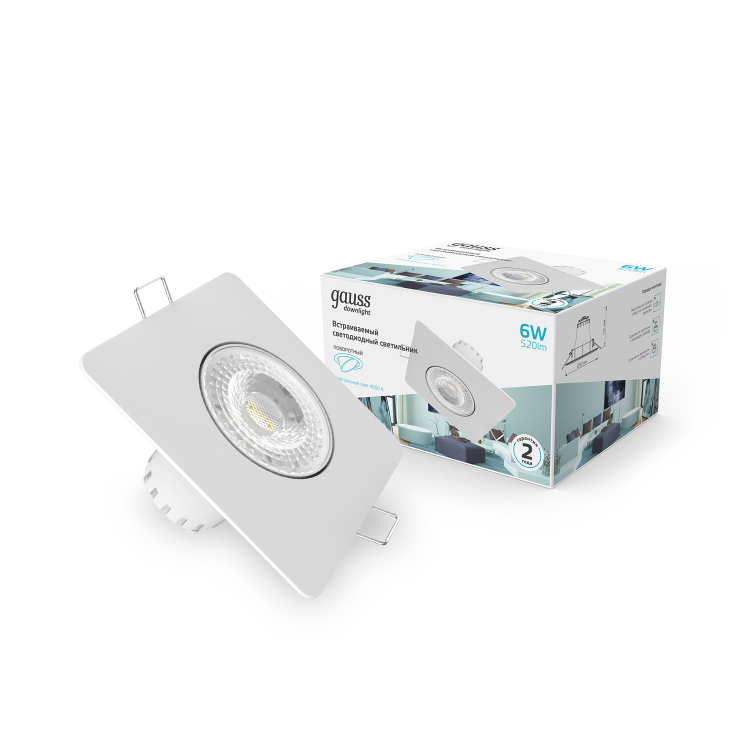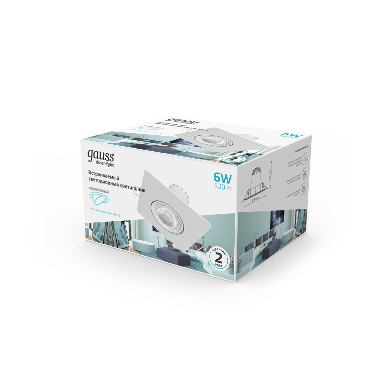 Светильник встраиваемый Gauss Downlight с поворотным спотом, мощность лампы 6w 520лм с нейтральным белым светом 4000К. Корпус светильника изготовлен из алюминия, окрашенного в белый цвет, внешняя форма - плоская минималистичная, монтажная глубина 5.6 см. Светильник предназначен для основного освещения соло или группой светильников, а так же акцентного или дополнительного освещения сухих помещений жилого или коммерческого назначения соответствующего пылезащите IP20. Это могут быть комнаты такие как гостинная, спальня коридор, библиотека или соответственно кафе, магазины, парикмахерские.