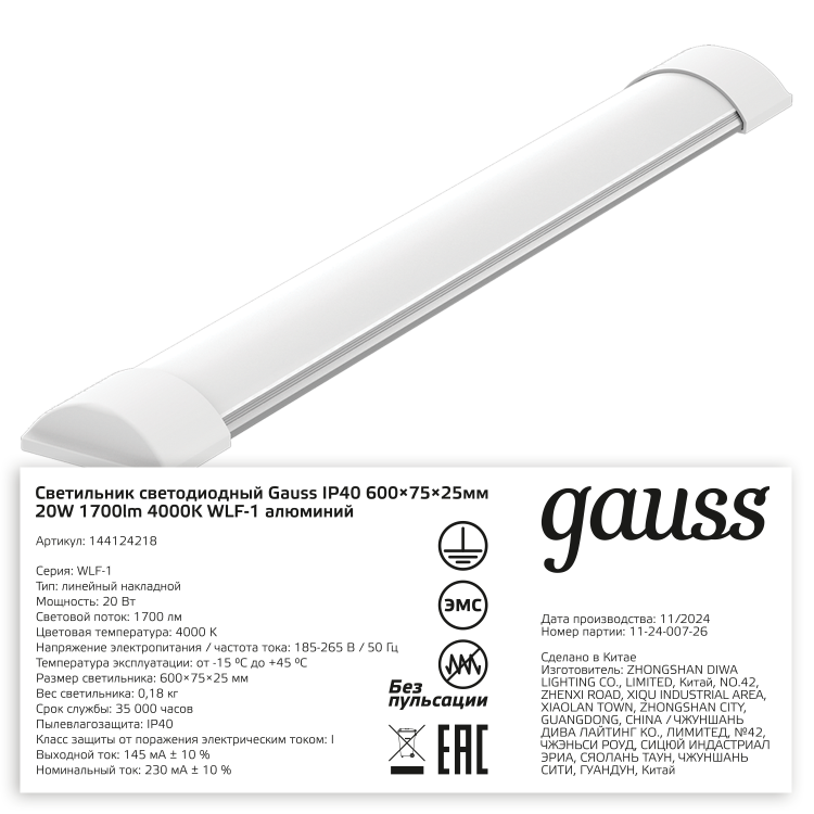 Светильник светодиодный матовый Gauss WLF-1 с уровнем защиты IP20 и мощностью 20w изготовлен специально для освещения помещений с низкими требованиями к пылевлагозащите и высокими к уровню освещения. Яркие светодиоды Sаnan имеют сверхяркий LED свет и высокий КПД и отлично подходят для жилых и и коммерческих помещений. В квартире или доме они прекрасно впишутся в ин терьер коридора, будут яркой подсветкой рабочей зоны кухни, отлично осветят гардеробную. В коммерческих и общественных заведениях они будут уместны в офисах, магазинах, коридорах, сухих складах.