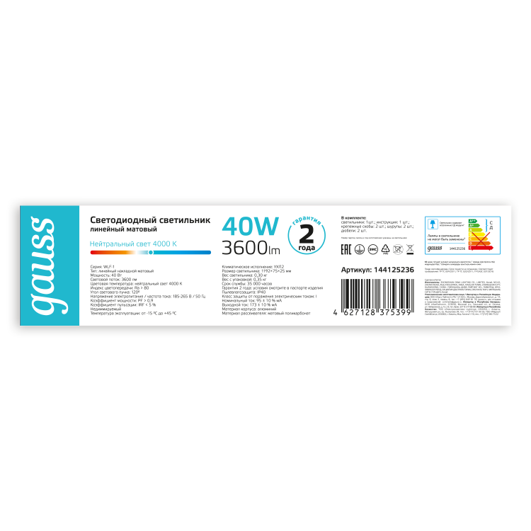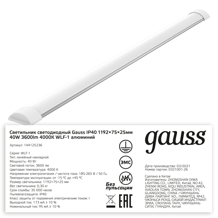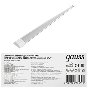 Светильник светодиодный матовый Gauss WLF-1 выполнен из анодированного алюминия с опаловым рассеивателем. Мощность светильника 40w яркие светодиоды Sаnan имеют высокий КПД и выдают световой поток 3600лм нейтрального белого света 4000К. Светильник предназначен для сухих помещений с рабочей температурой от -15 до + 45°C. Может быть использован в жилых помещениях: в квар тире или доме а так же коммерческих сухих незапыленных помещениях таких как оффисы,сухие подсобные помещения, торговые и выставочные залы, галереи, фудкорты.
