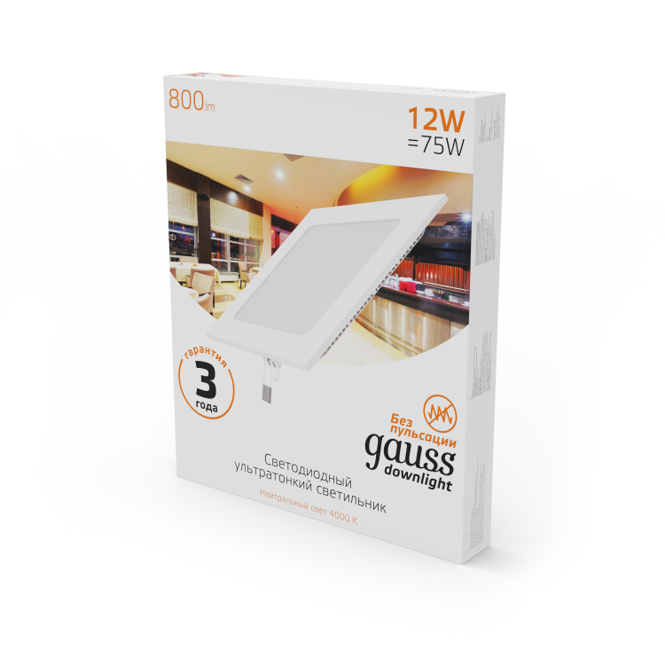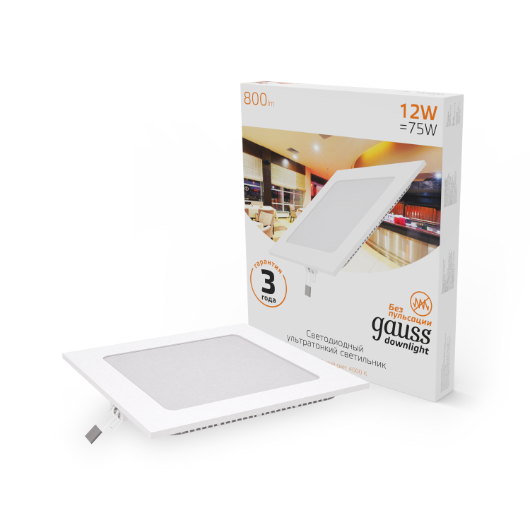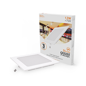 Светильник ультратонкий встраиваемый Gauss Slim Downlight квадрат 12w (аналог лампы накаливания 75w) цвет коруса белый. У него встроенные СД модули, световой поток мощный - 800лм теплого белого света 3000К. Светильник выгоден для монтажа на самые низкие потолки, так как встраиваемая глубина всего 2.2 см. Он изготовлен из прочного пластика, рассеиватель - аналог опалового стекла. Благодаря равномерному распределению света, он не слепит глаза и может быть использован в качестве дополнения к основному освещению или в количестве нескольких штук быть основным освещением любой комнаты с пылезащитой не превышающей IP20.
