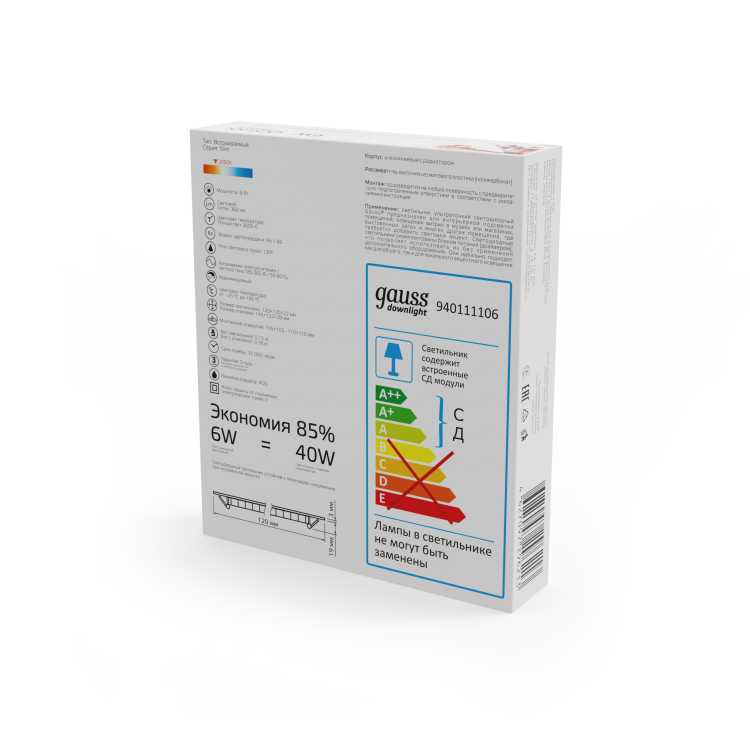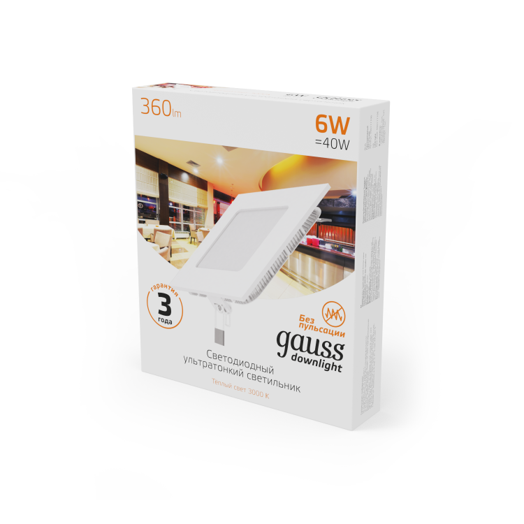 Светильник ультратонкий встраиваемый Gauss Slim Downlight квадрат 6w, соответствует лампе накаливания 40w. Это бюджетный, но при этом экономичный светильник со встроенными в корпус СД модулями, который может монтироваться в любой потолочный гипсокартон, так как глубина посадки всего 2.2 см. Светильник имеет нейтральный вид и подойдет для большинства современных дизайнов интерьера. Цветовая температура 3000К - теплый белый свет который будет уместен в гостинной, спальне, детской, коридоре, к тому же пылезащита IP20 позволяет использование только в сухих помещениях.
