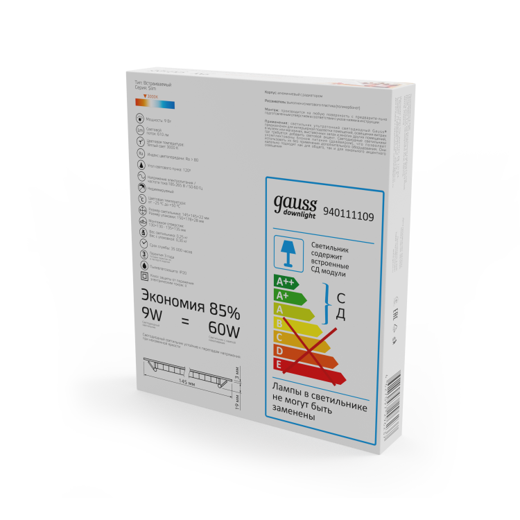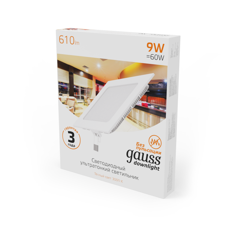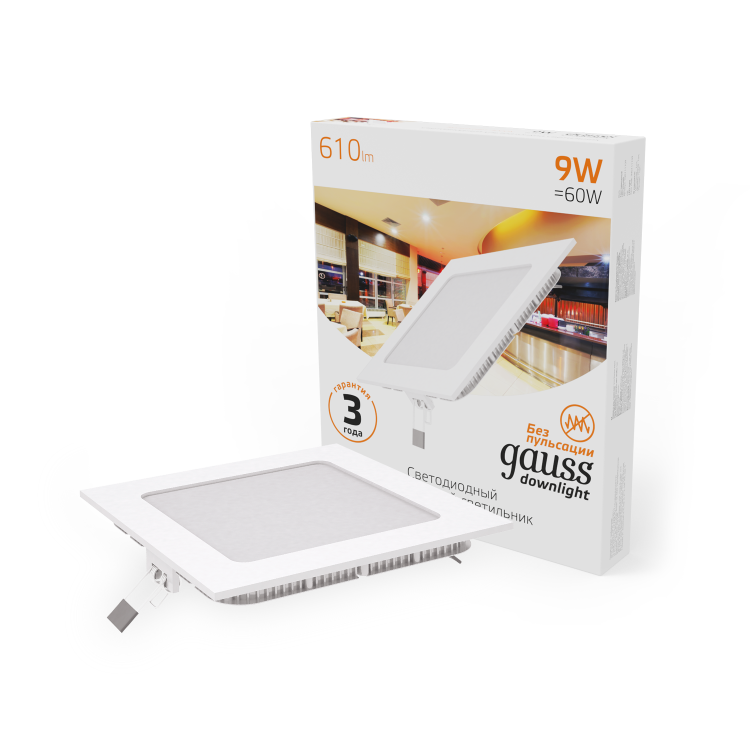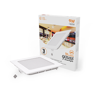 Светильник ультратонкий встраиваемый Gauss Slim Downlight квадрат 9w, соответствует лампе накаливания 60w при этом экономия электроэнергии составляет 85%. Светильник устойчив к перепадам напряжения без изменения интенсивности света. Яркость светового потока 610лм, цветовая температура 3000К (теплый белый свет). Материал корпуса - пластик, цвет белый; линзы - пластик, имитирующий опаловое стекло. Светильник монтируется в гипсокартон, подходит для низких потолков, так как имеет минимальную глубину посадки.