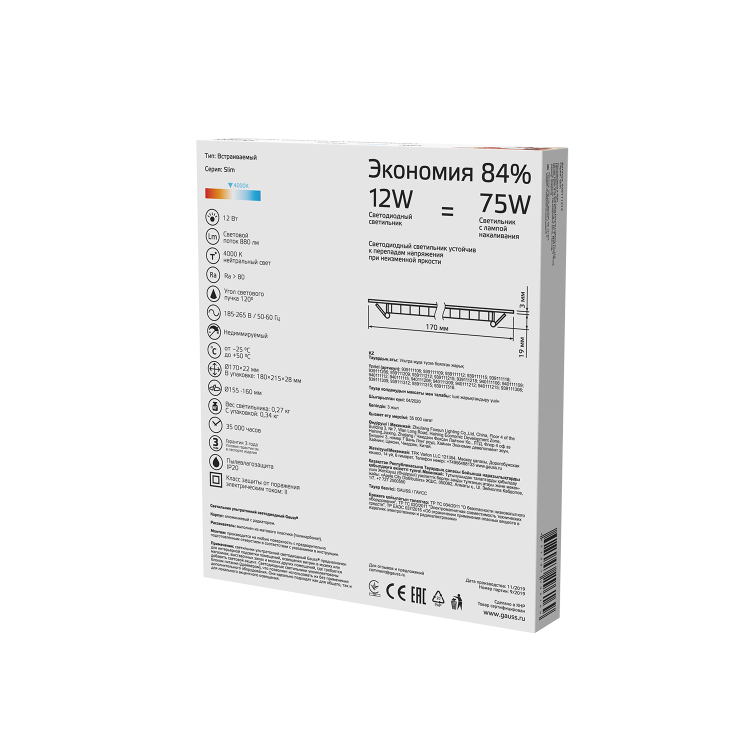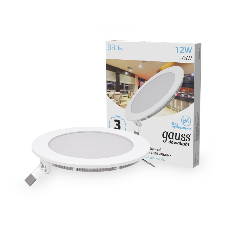 Светильник ультратонкий встраиваемый Gauss Slim Downlight круг 12w, соответствующий лампе накаливания 75w - это экономичный бюджетный светильник с выгодой в экономии электроэнергии в 84% и невысокой стоимости, благодаря использованию алюминиевого корпуса, опалового пластикового рассеивателя, а так же невысокой пылевлагозащиты IP20, что соответствует обычным квартирам и домам (кр оме ванной комнаты) и офисам коммерческих или бюджетных организаций. Цветовая передача 4000К - нейтральный белый свет, преимущественно используемый в рабочей зоне.