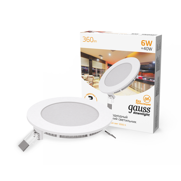 Светильник ультратонкий встраиваемый Gauss Slim Downlight круг 6w, соответствует лампе накаливания 40w и экономии электроэнергии 85%. У светильника нейтральный дизайн, подходит для большинства современных помещений в которых надо добавить свет не изменяя общий вид интерьера. Светильник подходит так же для подсветки витрин и стендов в качестве акцентного. Основное назначение - о свещение квартир и домов, офисов и сухих помещений, подходящих под требования светильника: IP20, диапазон температур от -25 до +50°С.