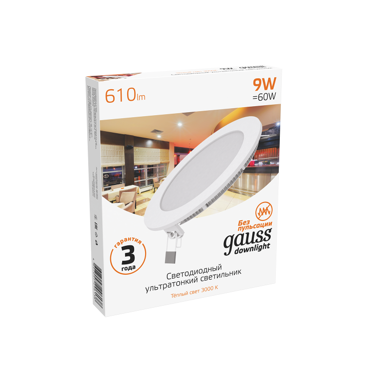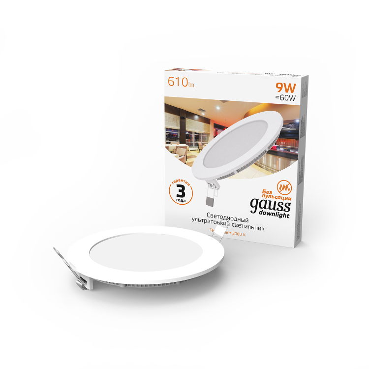 Светильник ультратонкий встраиваемый Gauss Slim Downlight круг 9w, соответствует лампе накаливания 60w, мощность светового потока 610лм, цветовая температура 3000К - это прекрасные лампы для освещения любых сухих жилых и не жилых помещений с пылезащитой IP20. У светильника алюминиевый корпус с радиатором и встроеным драйвером. Очень маленькая монтажная глубина всего 2.2см делает не важным общую высоту потолков. Внешний дизайн - умеренно-нейтральный, позволяет осветить помещение, не акцентируя внимания на самих светильниках, а исключительно на освещаемом предмете или территории.