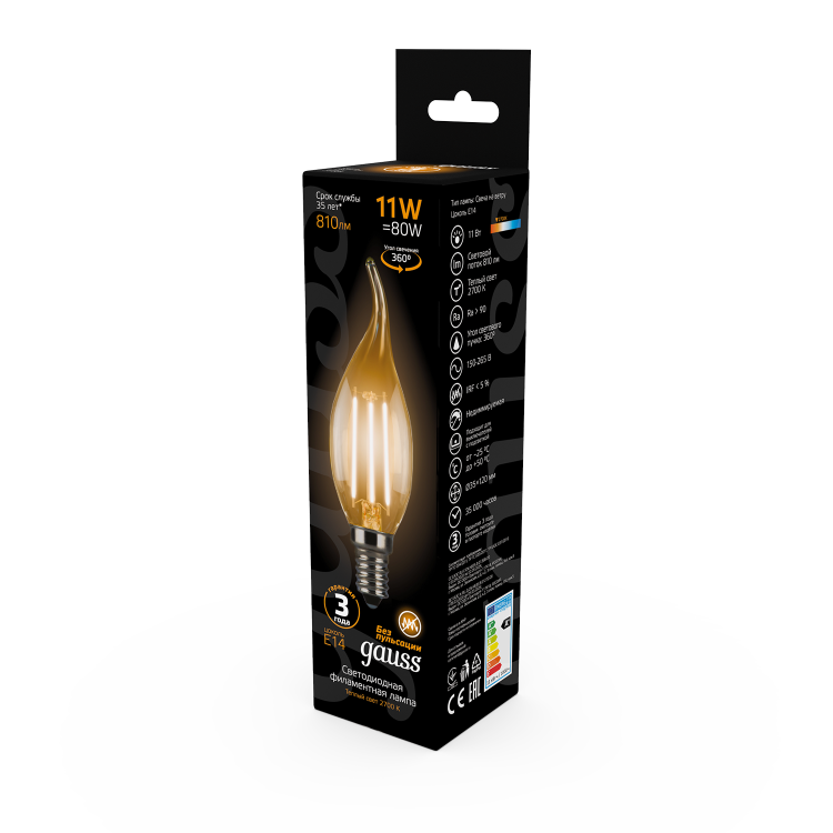 Лампа Gauss LED Filament Свеча на ветру E14 11W 720lm 2700K 1/10/50