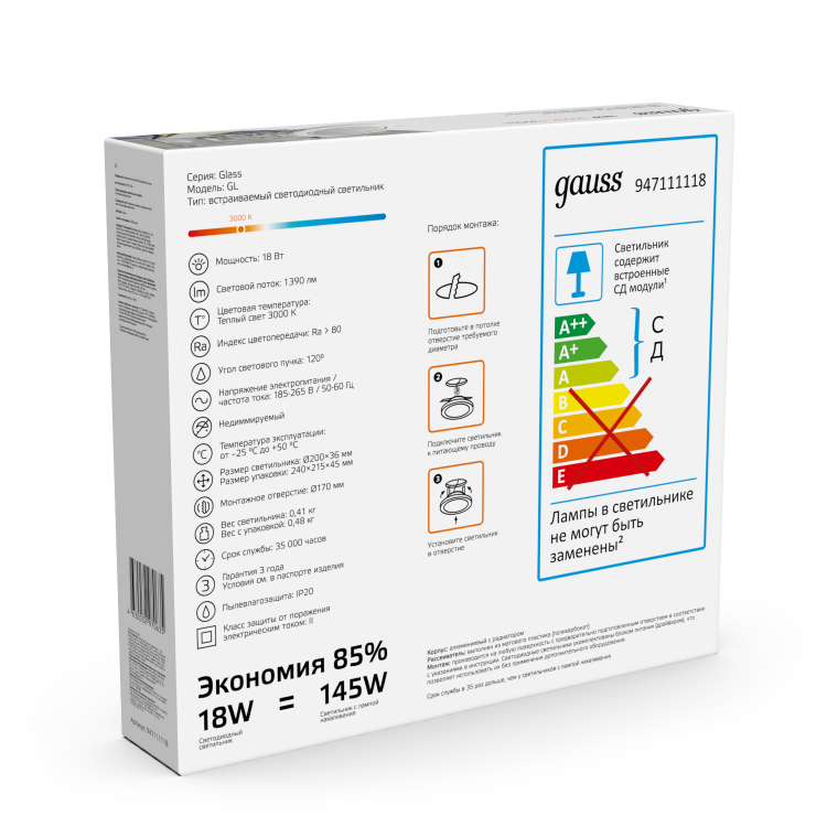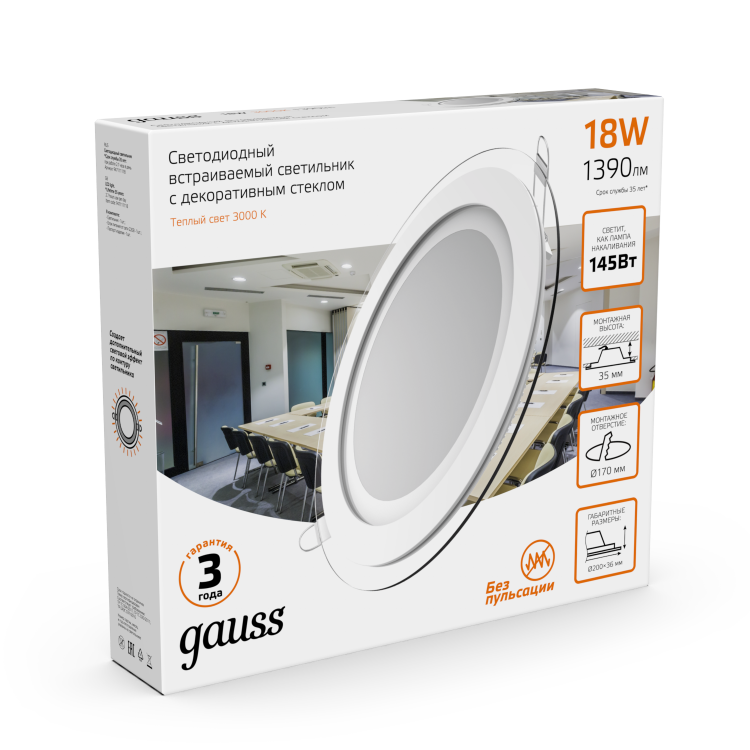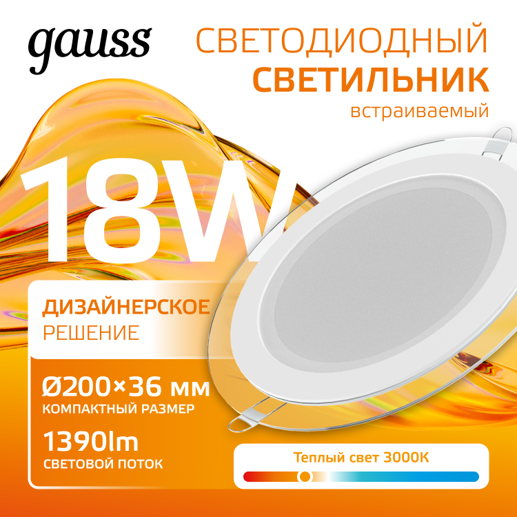 Светильник встраиваемый Gauss Downlight круг с декоративным стеклом и декоративным световым контуром. Мощность 18w, светит как лампа накаливания 145w, цветовая температура 3000К (теплый белый свет), световой поток 1390лм. Корпус выполнен из алюминия, окрашенного в белый цвет. Нейтральный лаконичный дизайн светильника найдет применение на всех видах натяжных, гипсокартонных или реечных потолков с глубиной просадки не менее 3.5см. Низкая пылевлагозащита исключает использование светильника в ванной, душевой и парной комнатах.