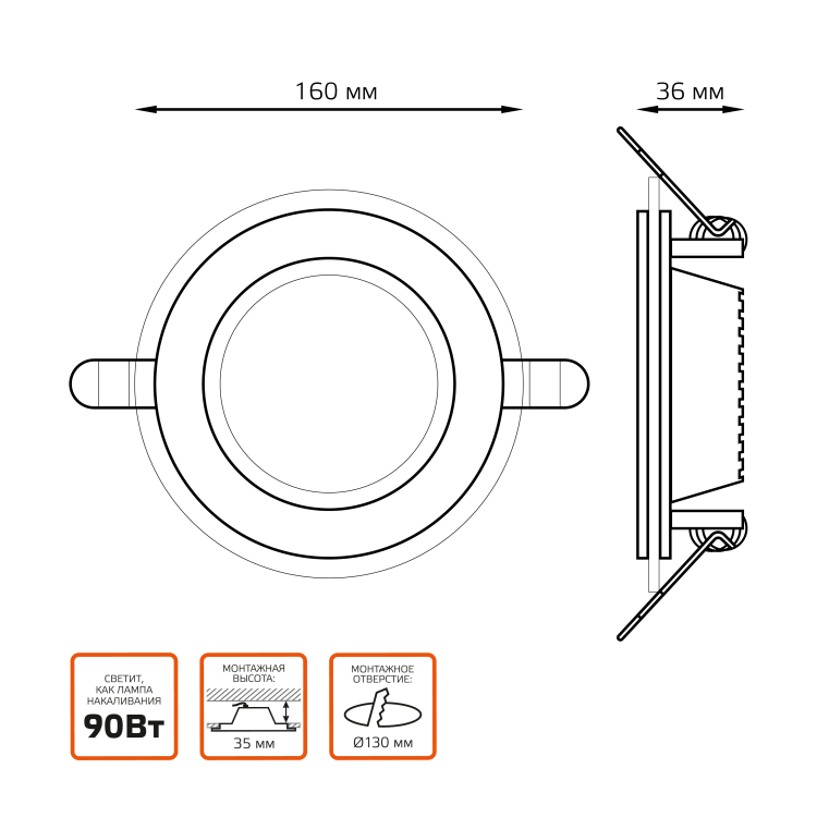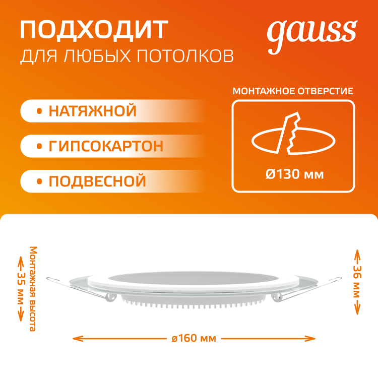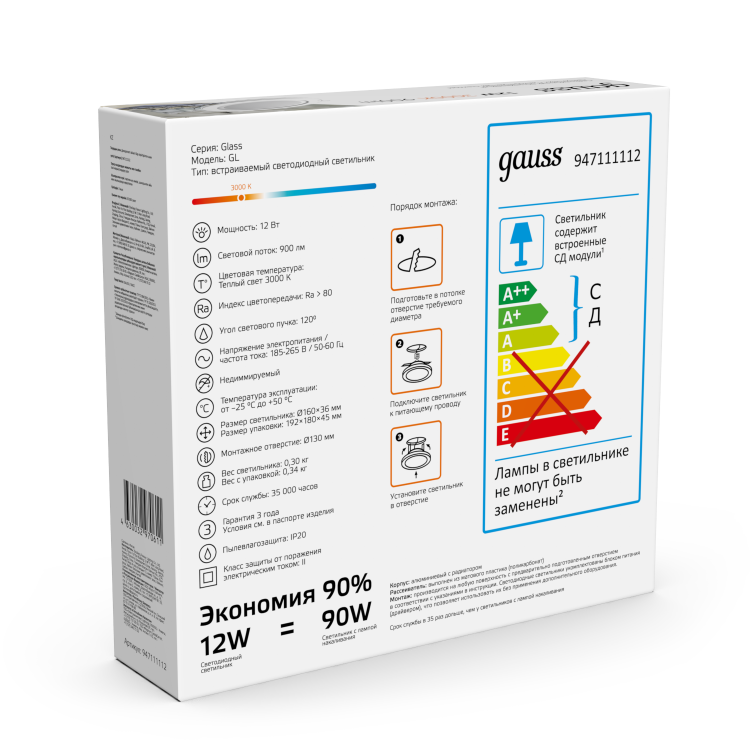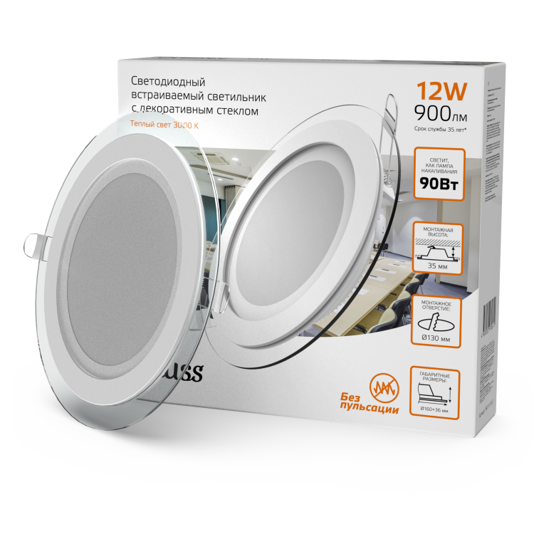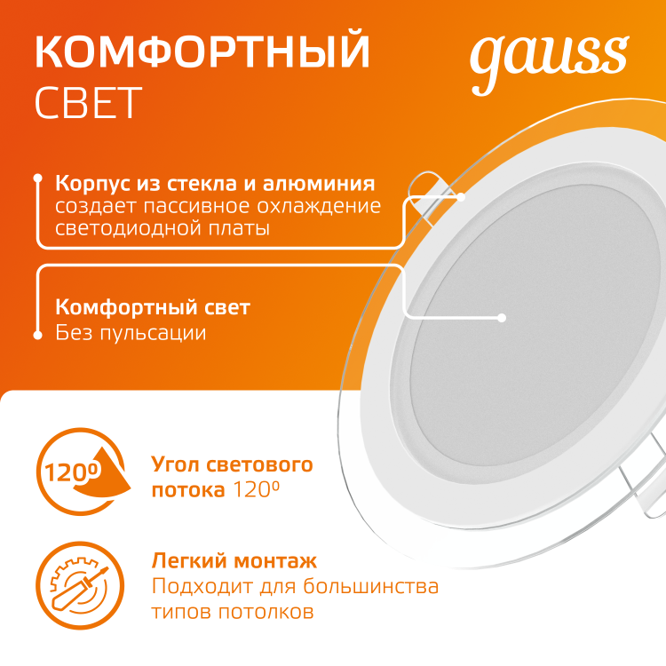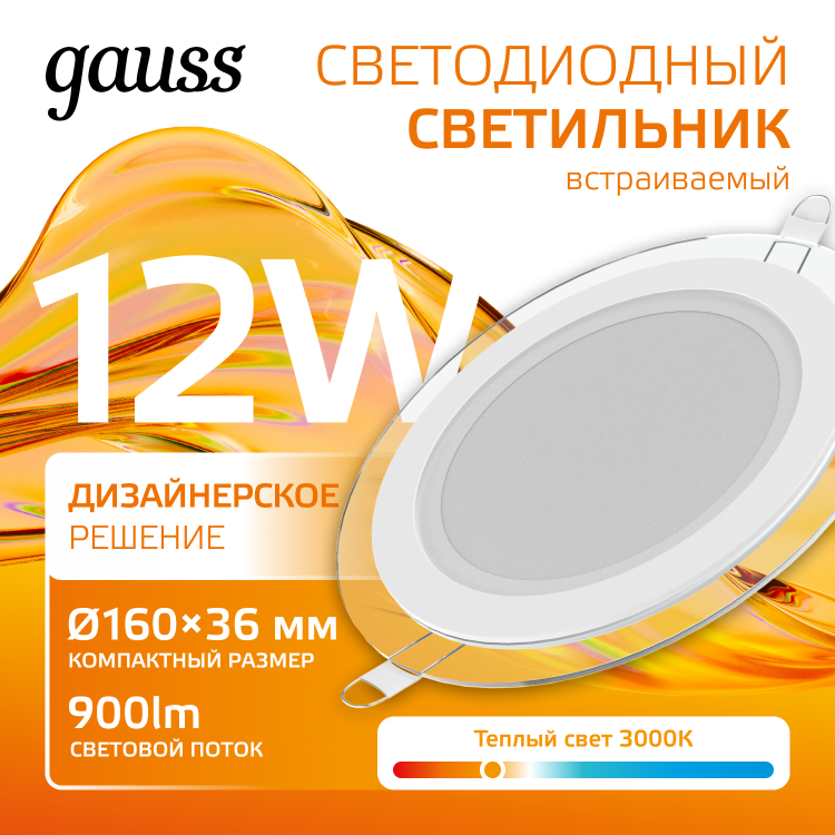 Светильник встраиваемый Gauss Downlight круг с декоративным стеклом, создает дополнительный световой эффект по контуру светильника. У него 12w мощности, соответствующих лампе накаливания 90w, что обеспечивает экономию электроэнергии 90%. Цветовая температура светильника теплая белая 3000К, мощность светового потока 900лм. Светильник будет отличным основным или фоновым освещением в любой жилой комнате, включая коридор, прихожую, библиотеку. Площадь освещения одним светильником 2.4м². Пылевлагозащита соответствует только сухим помещениям IP20.