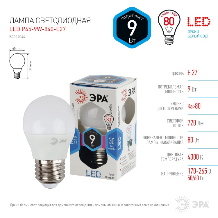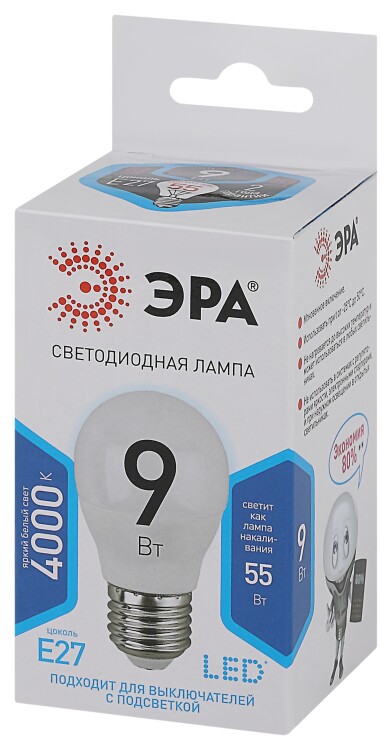Лампочка светодиодная ЭРА STD LED P45-9W-840-E27 E27 / Е27 9Вт шар нейтральный белый свет (кр. 1шт)