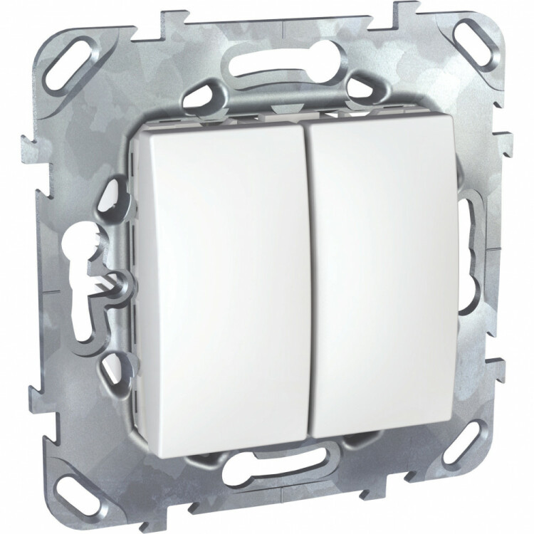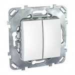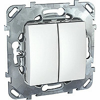 Переключатель двухклавишный Schneider Electric UNICA (белый) без подсветки предназначен для сетей до 250 В на ток до 10 А.