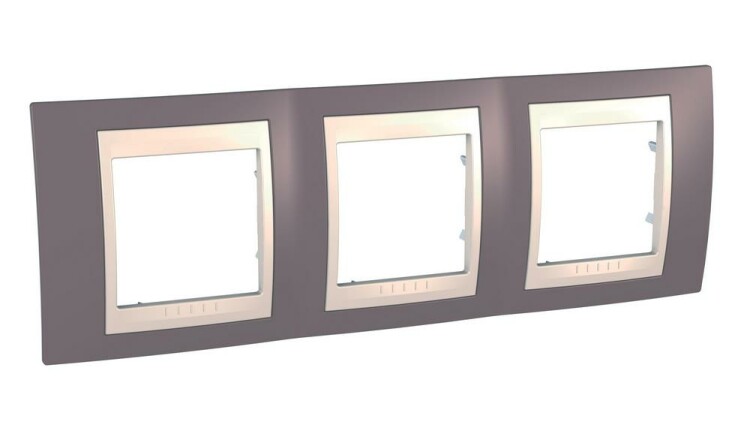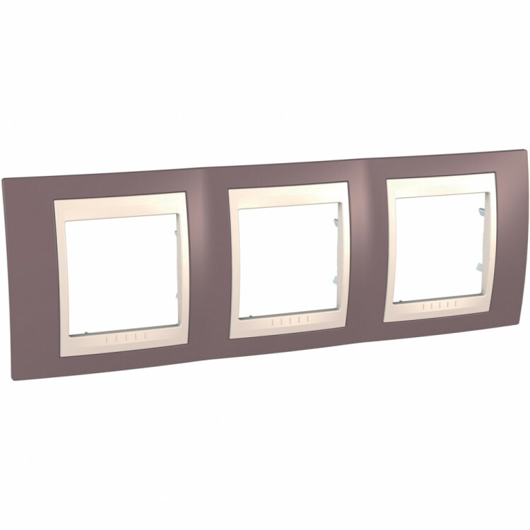 Рамка Schneider Electric UNICA ХАМЕЛЕОН (лиловый) трёхместная с бежевой декоративной вставкой.