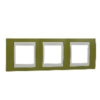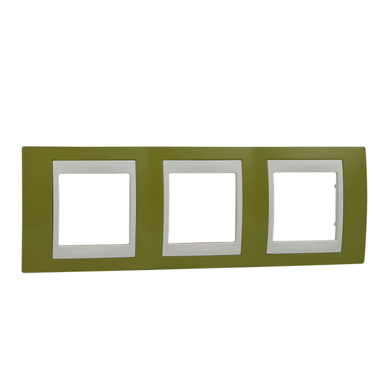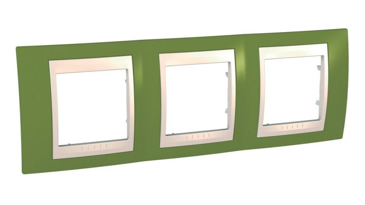 Рамка Schneider Electric UNICA ХАМЕЛЕОН (фисташковый) трёхместная с бежевой декоративной вставкой.