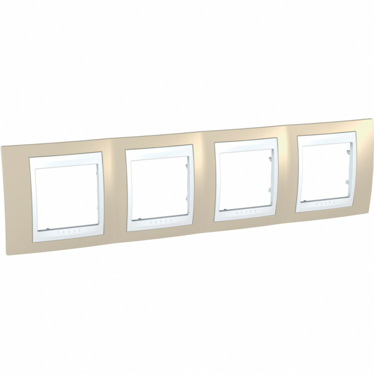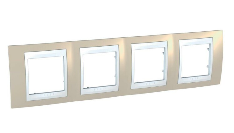 Рамка Schneider Electric UNICA ХАМЕЛЕОН (песчаный) четырёхместная с белой декоративной вставкой.