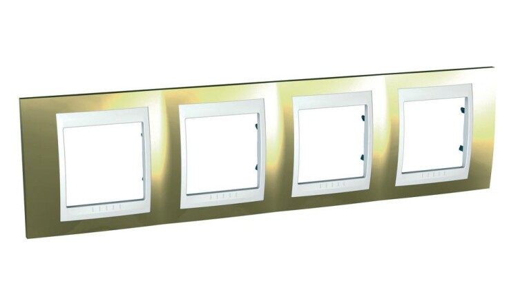 Рамка Schneider Electric UNICA ХАМЕЛЕОН (золото) четырёхместная с белой декоративной вставкой.