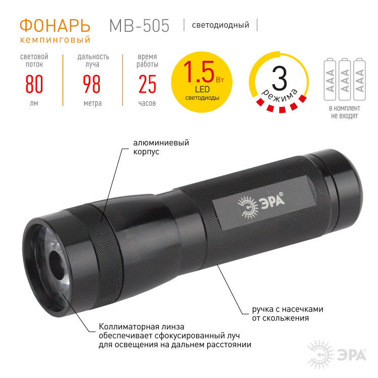 Универсальный светодиодный фонарь MB-505 с коллиматорной линзой. Коллиматорная линза обеспечивает сфокусированный луч для освещения на дальнем расстоянии. То есть, помимо защиты, эти линзы выполняют функцию фокусирования светового луча. В фонаре использованы светодиоды нового поколения мощностью 1,5 Вт. Такие светодиоды более энерго экономичны и обладают большим сроком жизни. Качество светодиодов определяет светоотдачу, яркость и цвет свечения. В светодиодах нового поколения светоотдача на 50% выше, чем в обычных, а цветовая температура более приближена к естественному свету.Корпус выполнен из анодированного алюминия, материала, стойкого к нагреву, к минусовым температурам и обладающий высокой ударопрочностью.Мощный, компактный и лёгкий фонарь не боится падений и светит ярким белым направленным светом. Дальность луча составляет 98 метров. Фонарь питается от трех батарее типа ААА. Без перерыва фонарь может работать 23 часа. В фонаре предусмотрено 3 режима. Универсальный фонарь подойдёт для повседневного использования, в комплекте предусмотрен ремешок на запястье для более удобного использования.
